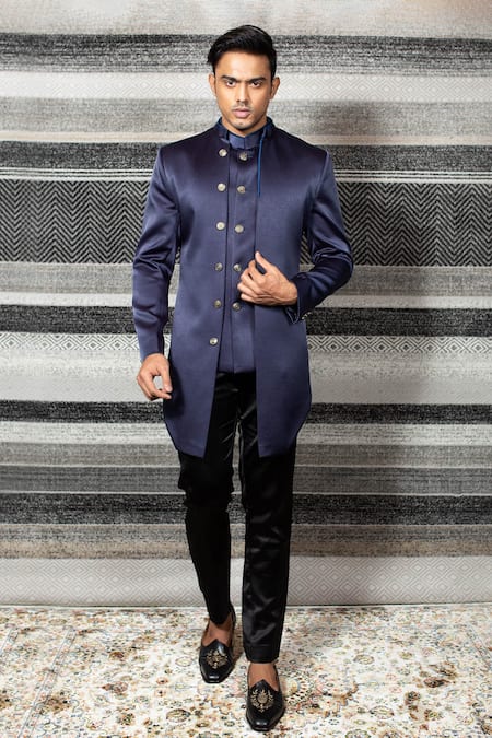 Navy blue layered bandhgala with front buttons & asymmetric hem. Paired with trouser.
