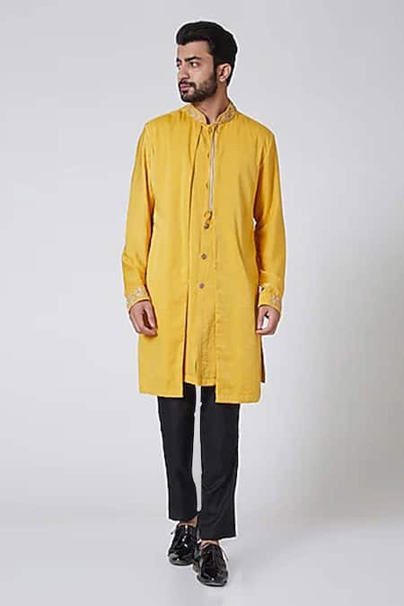 Yellow panelled kurta with embroidered band collar and full sleeves.